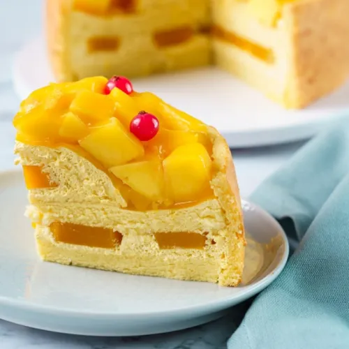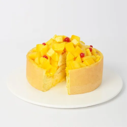 A refreshing beauty of mango mousse, soft vanilla sponge and succulent chunks of mango, wrapped in joconde sponge.