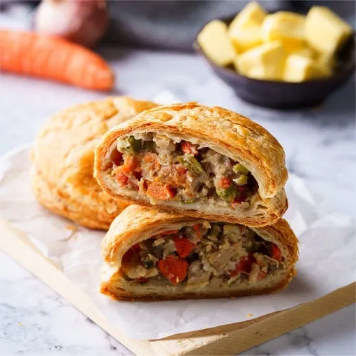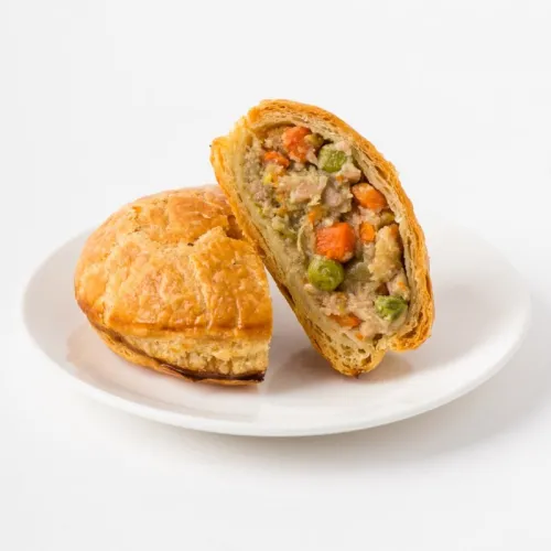 Tender chicken chunks with diced button mushrooms and mixed vegetables encased in flaky pastry and baked till golden brown.