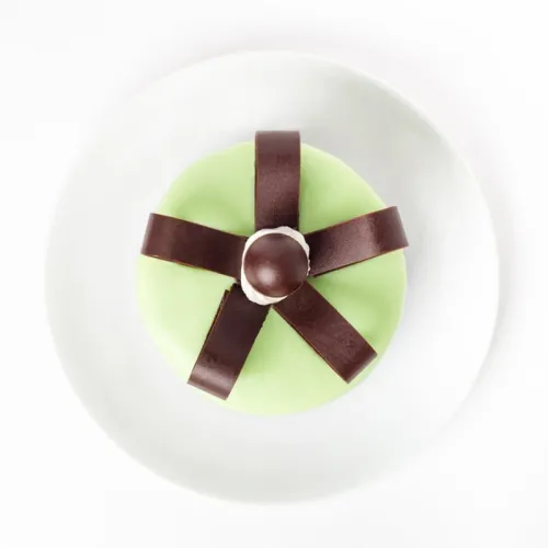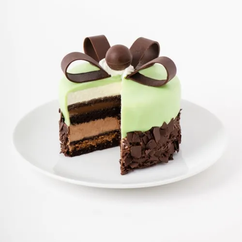 Indulge in refreshing mint cream with chocolate flourless sponge and chocolate ganache, accented with dark chocolate trimmings.