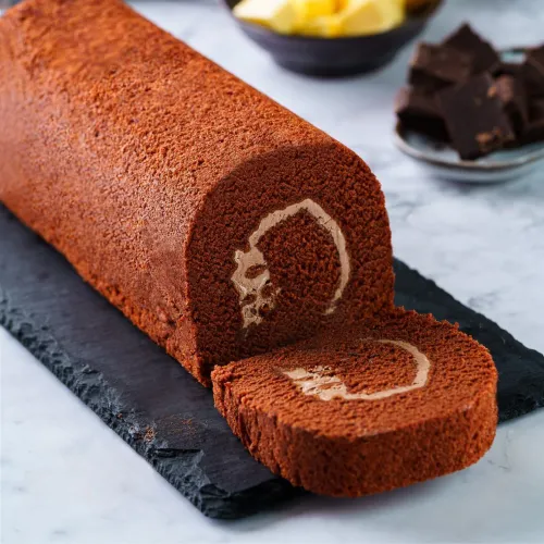 Chocolate Swiss Roll with rich chocolate buttercream. It’s highly recommended!