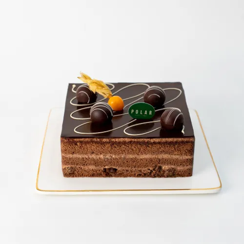A fluffy chocolate sponge cake lined with rich chocolate fresh cream and raisins, topped with chocolate truffle balls.