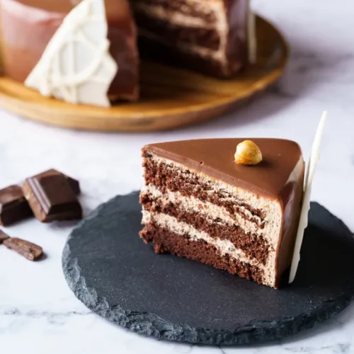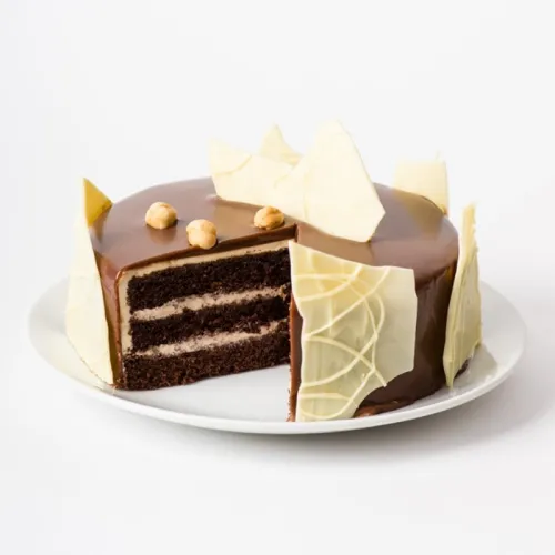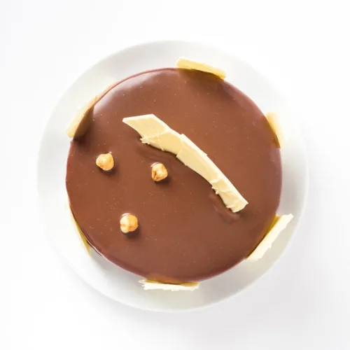Fragrant hazelnut praline paste, chocolate sponge and milk chocolate glaze, adorned with creamy white chocolate pieces.