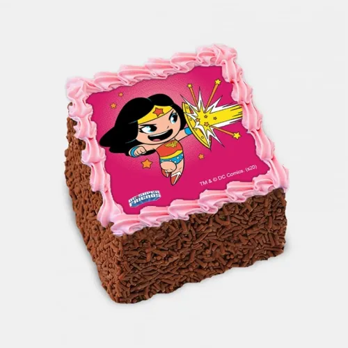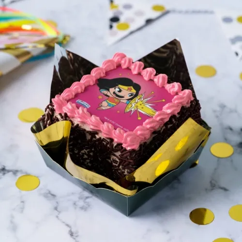 Choice of cake sponge layered with chocolate or vanilla bettercreme coated with chocolate rice. Topped with an edible character icing sugar sheet picture.