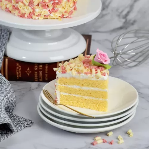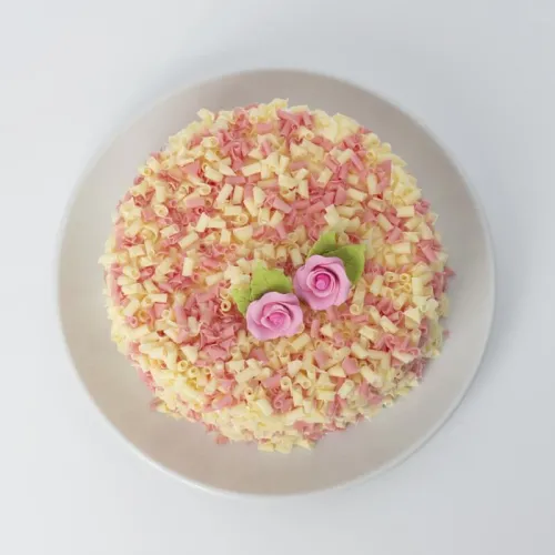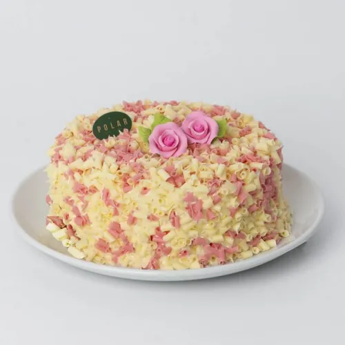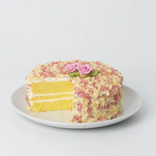 Sweet and demure, this fluffy vanilla sponge with buttercream is prettily dressed in a coat of white chocolate curls.