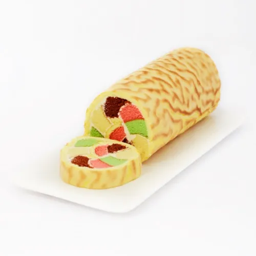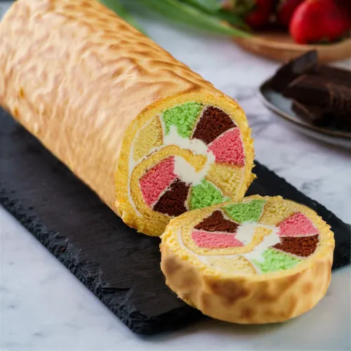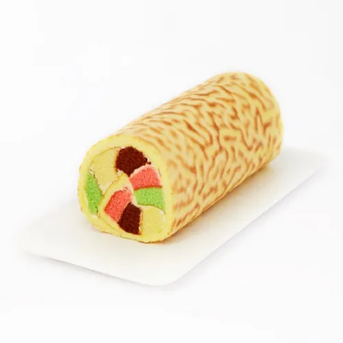 Tiger prints Swiss Roll wrapped around four flavours of scrumptious sponge cakes. Comes with a spread of good old fashioned buttercream. Flavours include: Chocolate, Strawberry, Pandan and Vanilla.