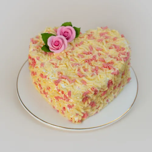 This timeless indulgence features soft, airy vanilla sponge layered with smooth buttercream, and is covered in delicate pink and white chocolate curls. The heart-shaped design makes it the perfect sweet gesture to show love and appreciation this Mother’s Day.