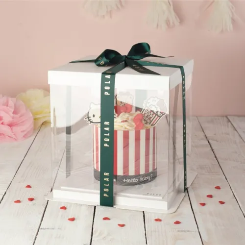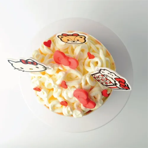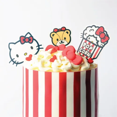 An eye-catching salted caramel cake topped with chocolate figurines and bows, in an adorable popcorn bucket exterior. This cake is a theatrical delight!