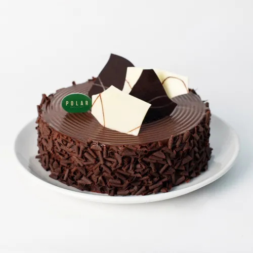 Sinfully rich chocolate fudge nestled between layers of soft chocolate sponge and blanketed with ganache, elegantly adorned with intricately designed dark chocolate pieces.
