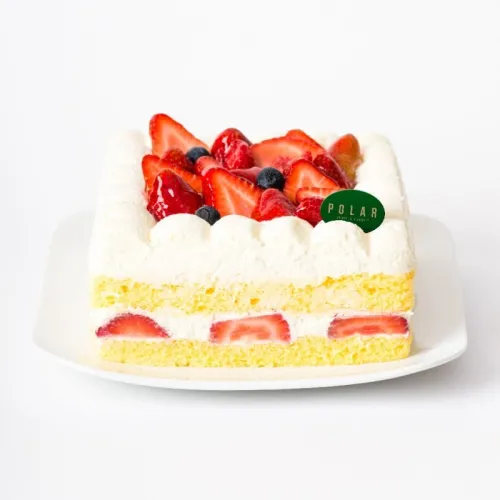 A pretty treat of light French cream and japanese sponge cake, topped with succulent strawberries, raspberries and blueberries.