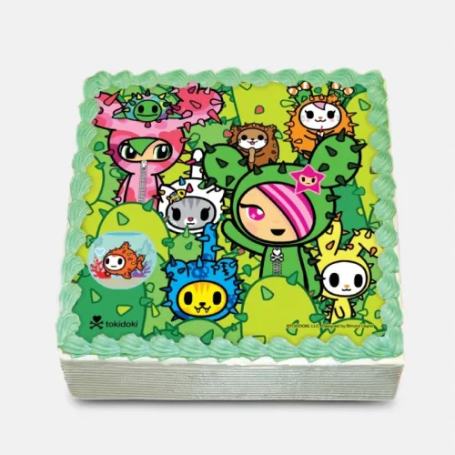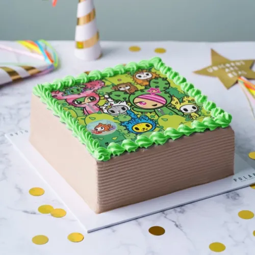 Choice of cake sponge layered with chocolate or vanilla bettercreme coated with chocolate rice. Topped with an edibl...
